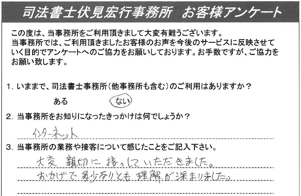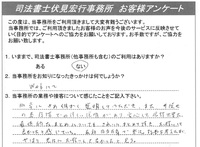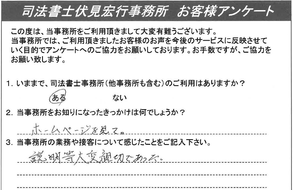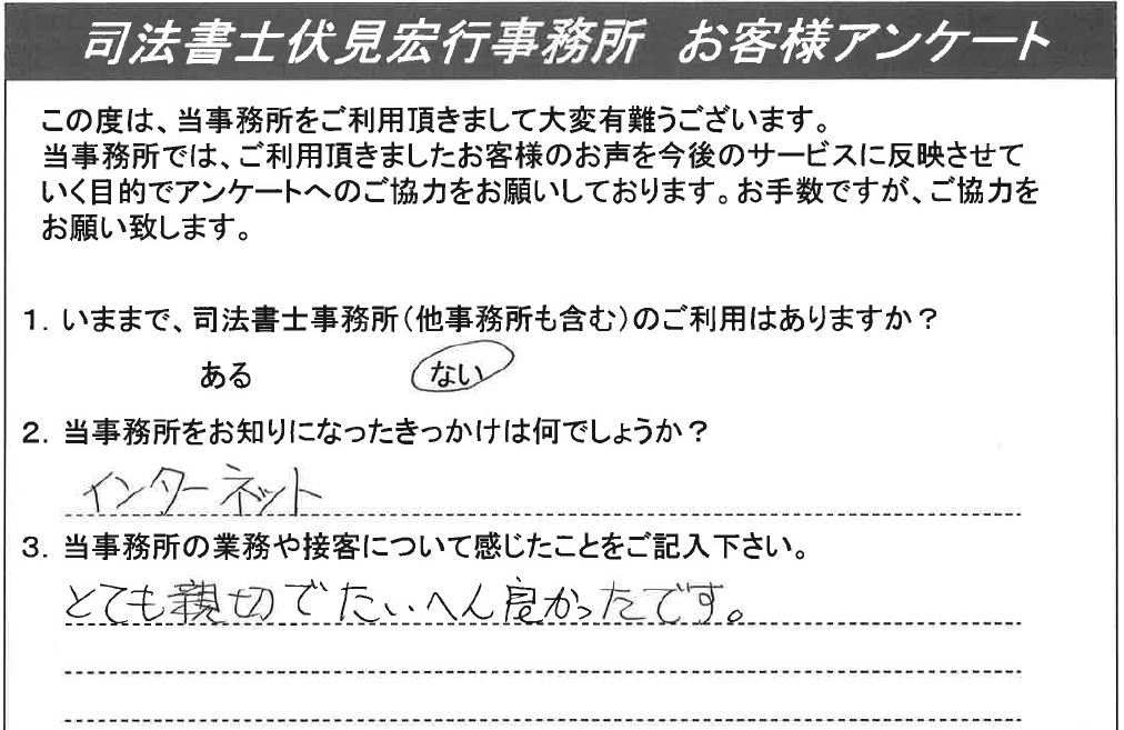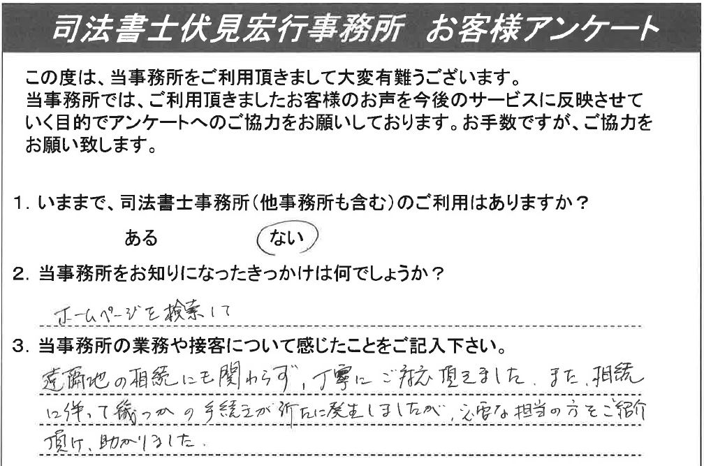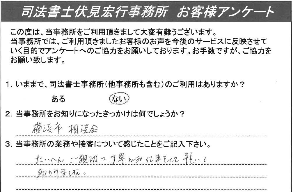 お客様の声 1 1.いままで、司法書士事務所のご利用はありますか?ない2.当事務所をお知りになったきっかけは何でしょうか?インターネット3.当事務所の業務や接客について感じたことをご記入ください。とても親切でたいへん良かったです。 お客様の声 2 1.いままで、司法書士事務所のご利用はありますか?ない2.当事務所をお知りになったきっかけは何でしょうか?横浜市相談会3.当事務所の業務や接客について感じたことをご記入ください。たいへんご親切に丁寧にお仕事をして頂いて助かりました。 お客様の声 3 1.いままで、司法書士事務所のご利用はありますか?ある2.当事務所をお知りになったきっかけは何でしょうか?ホームページを見て3.当事務所の業務や接客について感じたことをご記入ください。説明等大変親切であった。 お客様の声 4 1.いままで、司法書士事務所のご利用はありますか?ない2.当事務所をお知りになったきっかけは何でしょうか?ホームページを検索して3.当事務所の業務や接客について感じたことをご記入ください。遠隔地の相続に関わらず、丁寧にご対応頂きました。また相続に伴って幾つかの手続きが新たに発生しましたが、必要な担当の方をご紹介頂け、助かりました。 お客様の声 5 1.いままで、司法書士事務所のご利用はありますか?ない2.当事務所をお知りになったきっかけは何でしょうか?インターネット3.当事務所の業務や接客について感じたことをご記入ください。大変、親切に接していただきました。おかげで多少なりとも理解が深まりました。 お客様の声 6 1.いままで、司法書士事務所のご利用はありますか?ある2.当事務所をお知りになったきっかけは何でしょうか?インターネットで調べて3.当事務所の業務や接客について感じたことをご記入ください。親しみ易く緊張せず要求希望を話せ、また快く応じ、有限実行してくれた。話も分かり易く、会計も明朗で追加もなく、安心しました。駅から近いのも良い。 お客様の声 7 1.いままで、司法書士事務所のご利用はありますか?ない2.当事務所をお知りになったきっかけは何でしょうか?Webにて3.当事務所の業務や接客について感じたことをご記入ください。非常にきめ細かく説明していただき、また手続きの各段階での詳しい説明があり、安心して依頼出来た。最終的なまとめについても、きれいにまとめて頂き、お願いして良かったと感じている。最初自分自身ですることを考えたが、やはり、お願いして良かったと思う。